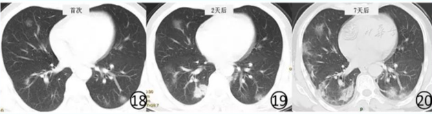 图15 男,38岁。CT平扫肺窗显示右上肺胸膜下有"反晕征" ,肺内有多发的小斑片状磨玻璃阴影, (2)进展期 病变进展时常见有多发新病灶出现。新病灶CT表现与上述早期病灶相似。原有病变多数病灶范围扩大,病灶内出现大小、程度不等的实变(图16,图17),有结节和晕征、实变病灶内可见空气支气管征。原有磨玻璃阴影或实变影也可融合或部分吸收,融合后病变范围和形态常发生变化,不完全沿支气管血管束分布(图18,图19,图20)。