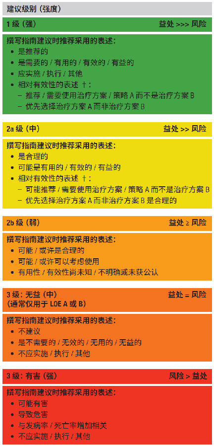缩略语:AHA,American Heart Association;CoSTR,Consensus on Science With Treatment Recommendations;GRADE,Grading of Recommendations, Assessment, Development, and Evaluation;ILCOR,International Liaison Committee on Resuscitation。 这些AHA重点更新用于更新2010年指南、2015年指南更新以及2017年和2018年重点更新的特定部分。该指南的综合版本可在线获取,并计划了2020年完整更新AHA关于CPR和ECC指南。 与往年一样,2019年重点更新使用AHA/American College of Cardiology推荐的系统和分类法,对建议级别和证据水平进行分类(表1)。由于这些摘要是作为概要设计的,因此它们未引用已发表的支持性研究,也未列出相关的建议级别或证据水平。 强烈建议读者访问CPR和ECC指南网站,阅读2019年重点更新,并访问ILCOR CoSTR网站了解更多详情。 表1.在患者护理的临床策略、干预、治疗或诊断测试中使用建议级别和证据水平(更新于2015年8月)*