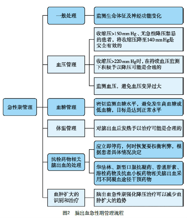 1 诊断及病因筛查 1.1 院前处置与诊断 推荐意见: ·患者一旦确诊为脑出血,应当立即分诊至卒中单元或神经重症监护病房(Ⅰ类推荐,A级证据)。 1.2 严重程度评分 推荐意见: ·基线严重程度评分应作为脑出血患者初始评估的一部分,但不应将评分作为对脑出血预后的唯一判断指标(Ⅰ类推荐,B级证据)。 1.3 脑出血的影像学评价 推荐意见: ·推荐应用神经影像(CT或MRI)进行快速影像学检查来鉴别缺血性卒中与脑出血(Ⅰ类推荐,A级证据)。 ·可考虑行CTA和对比增强CT扫描来帮助识别具有血肿增大风险的患者(Ⅱb类推荐,B级证据)。 ·当临床特征和初始影像学检查怀疑血管病变或肿瘤时,可选择行增强CT扫描、CTA、CTV、MRI、MRA、MRV及DSA确定诊断(Ⅱa类推荐,B级证据)。 1.4 脑出血病因筛查 脑出血患者对症处理的同时,需尽快明确脑出血原因,针对病因进行治疗。 2 急性期管理 应将脑出血急性期患者送入卒中单元,给予持续生命体征监测、对症治疗(图2)。
