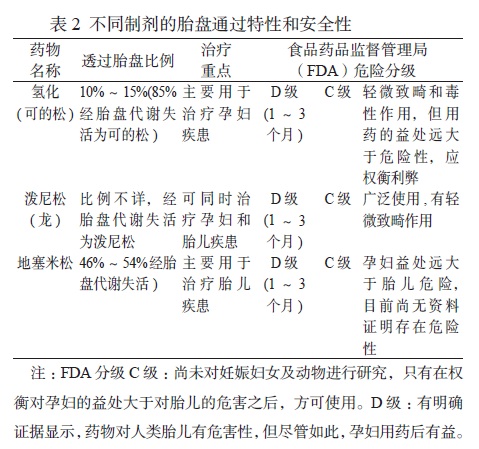 2 糖皮质激素急诊使用时应注意的主要不良反应及应对措施 2.1 诱发和加重感染 是急诊使用激素最为担心的不良反应。应用糖皮质激素使机体防御机能降低,易诱发感染和使潜在的病灶扩散。尤其是当泼尼松>15mg/d 时,可能损伤机体抗感染的免疫功能。常见有金黄色葡萄球菌、真菌和病毒感染,以及结核病灶的扩散。 【建议】激素剂量越大,疗程越长,诱发和加重感染的危险越高。使用时需警惕感染,一旦有相关证据及时加用抗生素。 2.2 诱发和加重溃疡 消化性溃疡是激素常见的不良反应之一,与剂量有关。 【建议】每日10mg泼尼松的胃肠道不良反应远低于各种常用的非甾体抗炎药,无需特殊用药。但大剂量使用激素时建议加用胃黏膜保护剂或抑酸药。 2.3 医源性肾上腺皮质功能亢进 急性期应该注意的是低血钾、水肿、高血压、高血糖。另外,肾上腺皮质功能亢进还表现为向心性肥胖,满月脸、皮肤紫纹、痤疮、多毛、乏力等。这些副反应多在停药后可以逐渐地自行消失或减轻。 【建议】使用激素期间应该监测电解质、血压、血糖以及患者容量状况。 2.4 其他需要注意的不良反应 如无菌性股骨头坏死、对生殖功能的影响、对儿童生长发育的影响、行为与精神异常等。糖皮质激素可能引起骨质疏松与自发性骨折,因此长期使用者,不论剂量大小,均应常规补充钙盐及维生素D制剂,必要时加用二磷酸盐制剂;另外,如果连续使用泼尼松(20~30mg/d)2周以上突然停药,则可能出现肾上腺皮质功能不全的撤药反应,因此需要注意逐渐减量。 3 糖皮质激素急诊使用的剂量、疗程以及撤药 3.1 急诊糖皮质激素不同剂量的选择(按照泼尼松剂量计) ⑴ 冲击治疗剂量:一般静脉给药,500~1000mg/d,疗程多小于5d,后减到1~2mg/(kg·d),适于危重患者的抢救,如狼疮脑病、重症药疹、重症肌无力(有呼吸机支持时)、自身免疫性边缘叶脑炎等。不良反应明显,尤其容易继发感染。需配合其他有效治疗措施,有的情况可迅速减药,也有的需要逐渐减量; ⑵ 大剂量:1~4mg/(kg·d),多见于冲击剂量减药过渡方案,一般不超过5~7d ;也可见于有冲击治疗指征而顾忌感染等并发症的妥协方案; ⑶ 足量:1mg/(kg·d),激素与激素受体全部结合。适于多数疾病的早期控制。容易继发感染。一般不超过1个月; ⑷ 中等剂量:0.5~1mg/(kg·d), 激素受体的饱和度逐渐增加,适于部分疾病的控制或减量时的中途剂量; 3.2 糖皮质激素使用的不同疗程: ⑴ 短程治疗:疗程小于1个月,包括感染或过敏性疾病,如结核性脑膜炎、肺孢子菌肺炎、重症药疹等。停药时需逐渐减量至停药。 ⑵ 长程治疗:疗程大于1个月,适于自身免疫性疾病,如系统性红斑狼疮、溶血性贫血等。需逐渐减量,维持治疗可采用每日或隔日用药。 3.3 糖皮质激素的撤药 短疗程者可快速减药;长疗程者需缓慢减药,遵循“先快后慢”原则: ⑴ 激素疗程在7d之内者,可以直接停药,而超过7d者,则需要先减药后撤药; ⑵ 泼尼松30mg/d×2周者,可以每3~5d减少泼尼松5mg/d的剂量; ⑶ 泼尼松50mg/d×4~8周者,则需要每1~2周减少泼尼松5mg/d的剂量,至20mg 左右后每2~4周减5mg。若在减药过程中病情反复,可酌情增加剂量。 4 全身用糖皮质激素类药物妊娠期用药 妊娠女性应用糖皮质激素可能增加胎儿发生腭裂的风险,但是绝对危险度很可能较低。尚缺乏有说服力的证据证明糖皮质激素可以导致胎儿肾上腺皮质功能减退症。不同制剂的胎盘通过特性和安全性见表2。