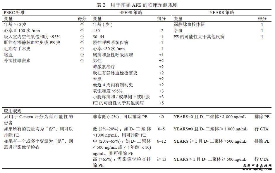 需要注意的是,尽管D-二聚体检测简单经济、敏感度高,但因特异度较差,常在低风险患者中出现假阳性结果。为解决这一问题,多个新的临床预测规则被探索和开发,包括肺栓塞排除标准(Pulmonary Embolism Rule Out Criteria,PERC)、四级肺栓塞临床概率评分(4-Level Pulmonary Embolism Clinical Probability Score,4PEPS)、YEARS 策略和肺栓塞分级D- 二聚体(Pulmonary Embolism Graduated D-Dimer,PEGeD)策略(见表3)[52, 57-59]。PERC仅包含临床变量,无需检测D-二聚体,但仅适用于已被Geneva评分分类为低风险的患者。4PEPS评分、YEARS策略和PEGeD策略则根据不同的CPP水平,应用了不同的D-二聚体临界值来判断D-二聚体是否为阳性[53]。2019年ESC APE指南推荐,可以考虑使用与CPP相匹配的D-二聚体临界值来排除APE(IIa类推荐,B级证据)[43]。
